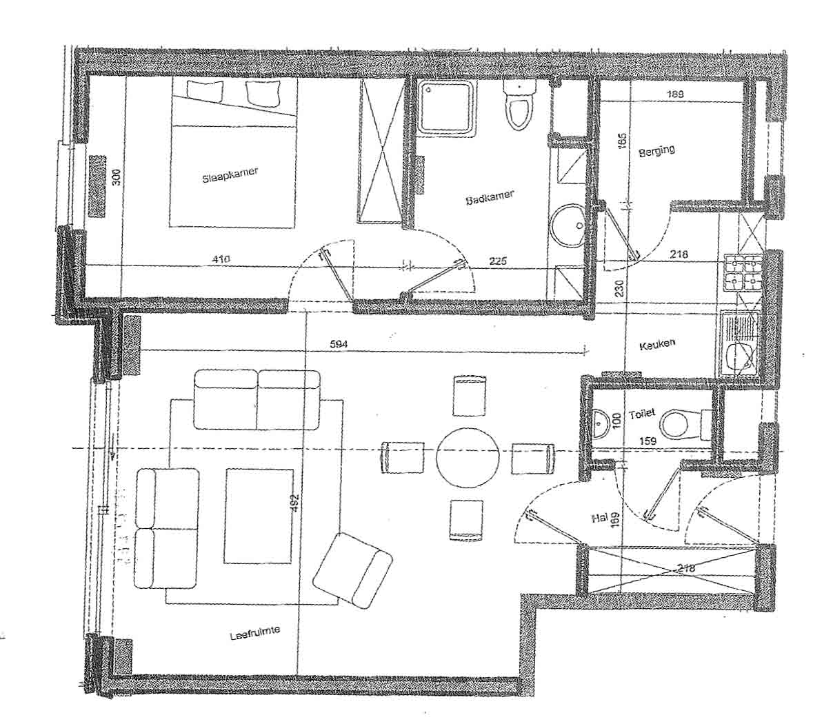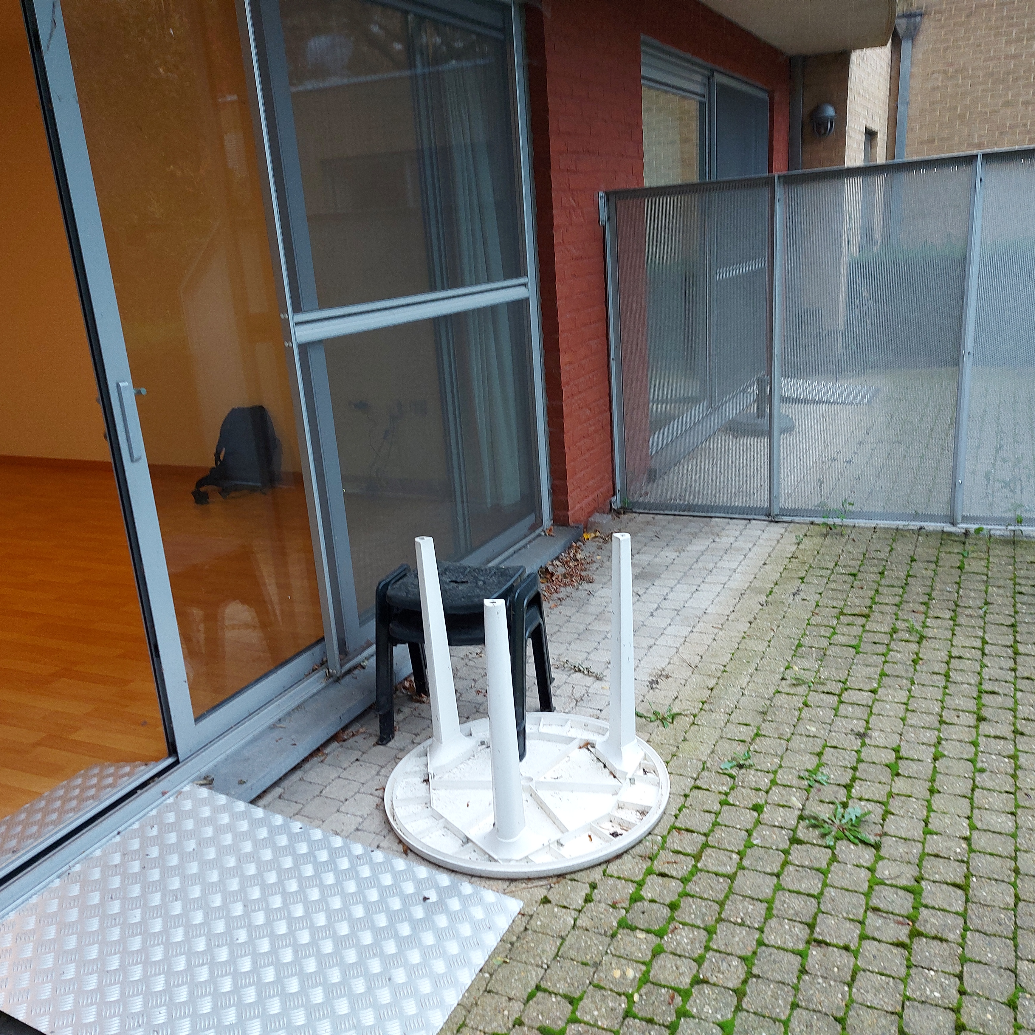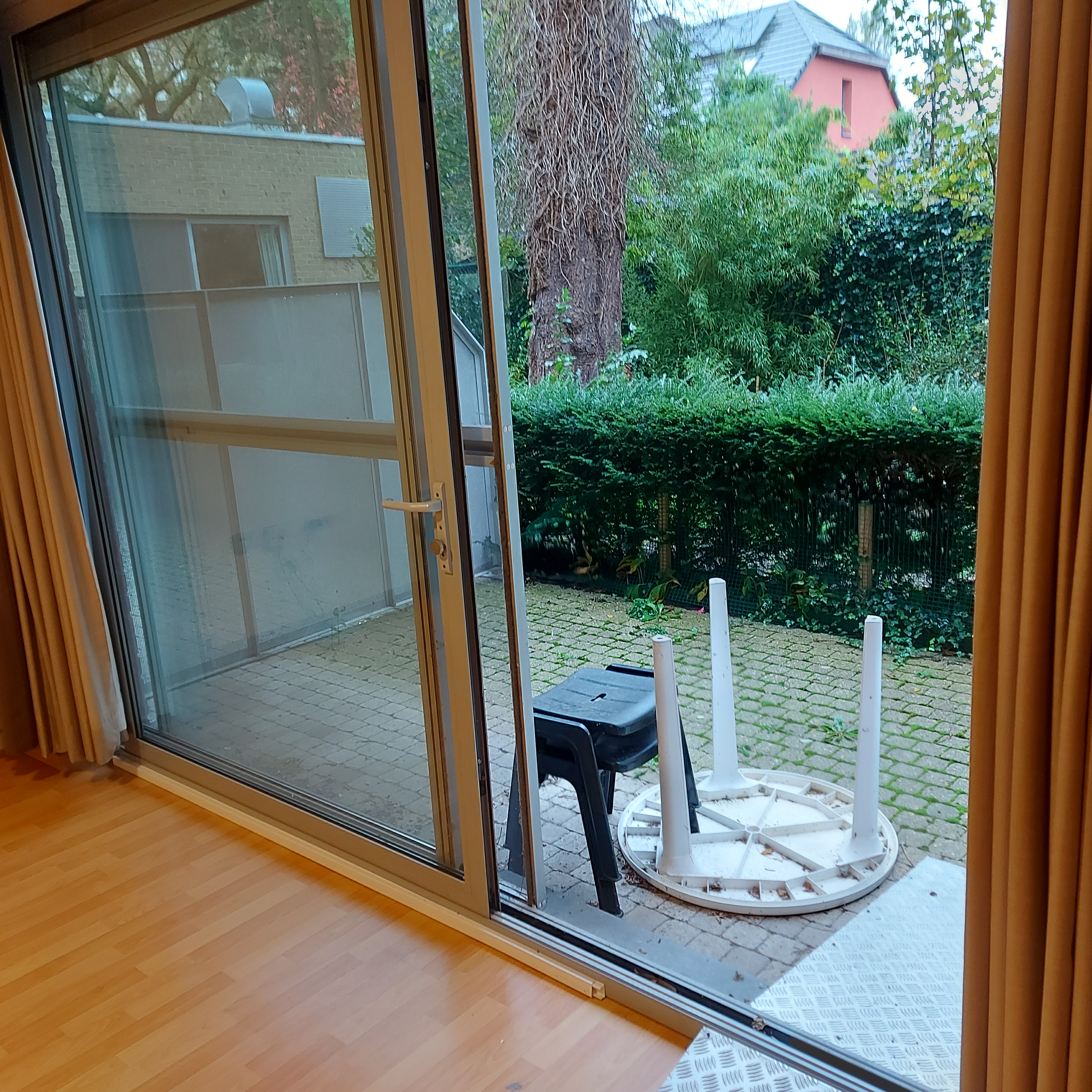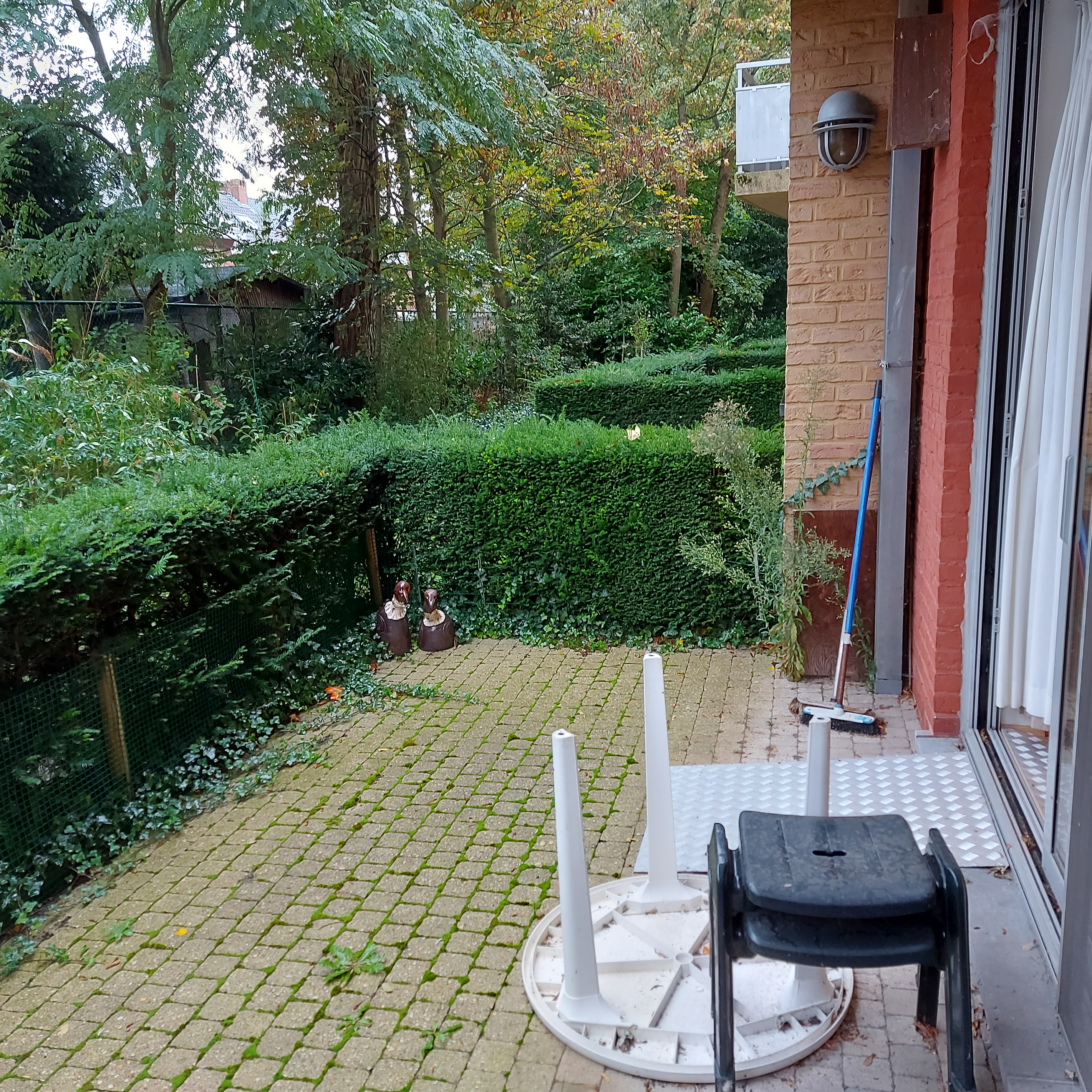 De flat ligt op het gelijkvloers, heeft een terras die in de tuin ligt en heeft 1 slaapkamer, een badkamer met inloopdouche, toilet en lavabo, een keukentje, een ruime living, een berging, een apart toilet naast de hal en in de garage/kelder een bergplaats.